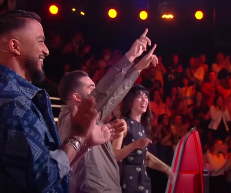 The judges, Slimane, Patrick Fiori, Kendji Girac, and Nolwenn Leroy, were seated with their backs turned, as is tradition on the show.