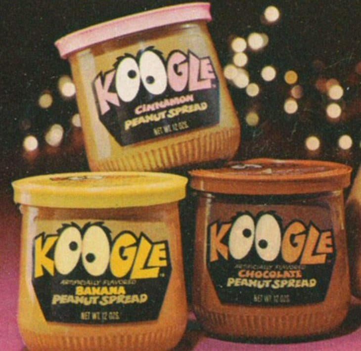 Kraft introduced Koogle in 1971, a peanut butter spread similar to Nutella. Its key appeal was that it didn’t make your mouth sticky like regular peanut butter. Available in four flavors—chocolate, banana, vanilla, and cinnamon—Koogle was a hit with kids, thanks in part to its quirky alien mascot with four eyes, messy blue hair, and a big “K” on its chest. Despite its popularity, Koogle was discontinued in the late 1970s, bringing an end to this fun and tasty treat.