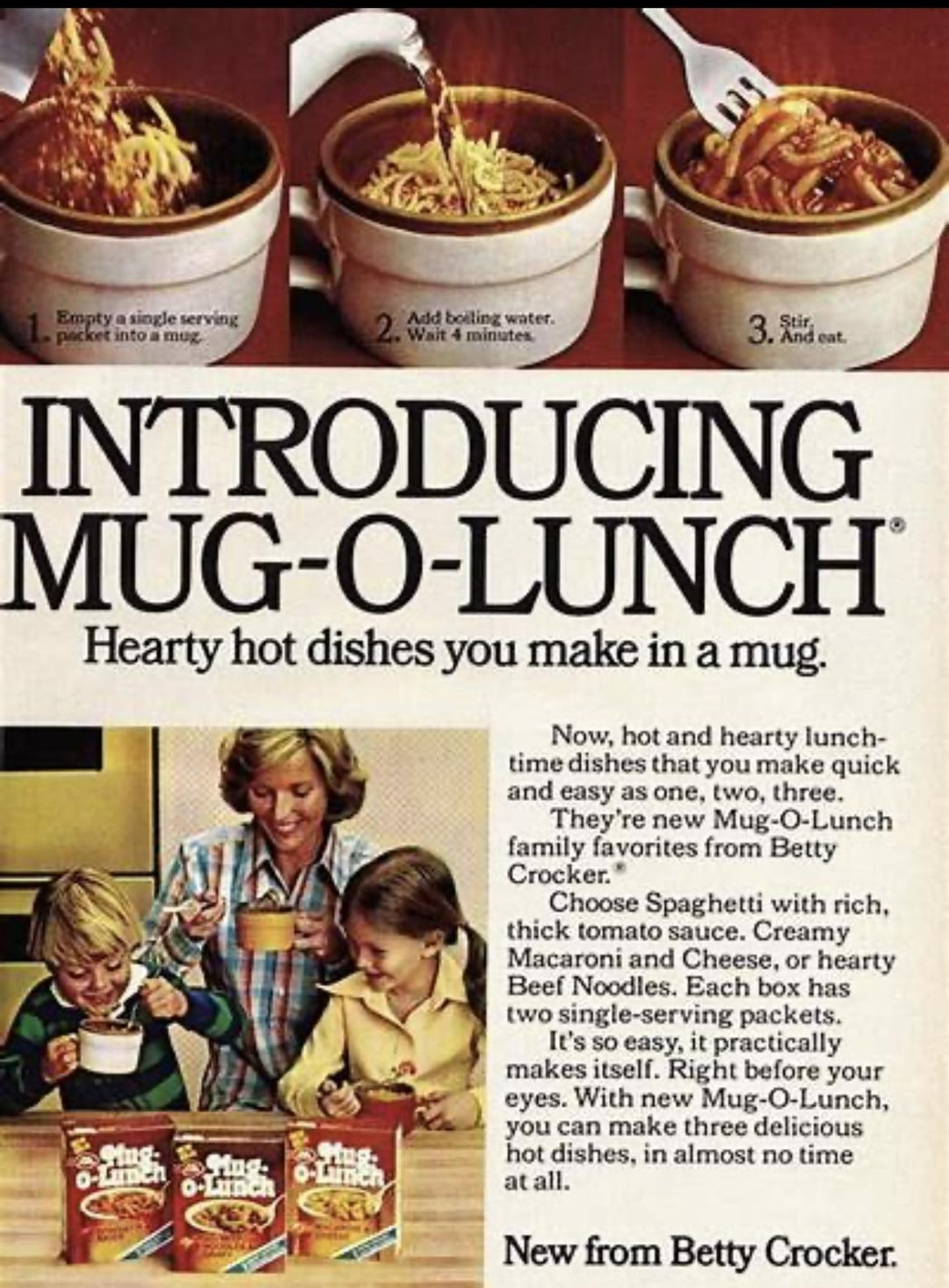 With instant noodles in high demand, Betty Crocker introduced Mug-O-Lunch in 1977. Available in four flavors—Macaroni & Cheese, Beef Noodle, Chicken Noodle, and Spaghetti—it was as simple as adding boiling water. However, the small portions were a problem. While enough for a kid, adults needed at least three to feel full, and no one wanted to boil water that many times. It quickly became clear that making real mac and cheese was easier, leading to the downfall of Mug-O-Lunch.