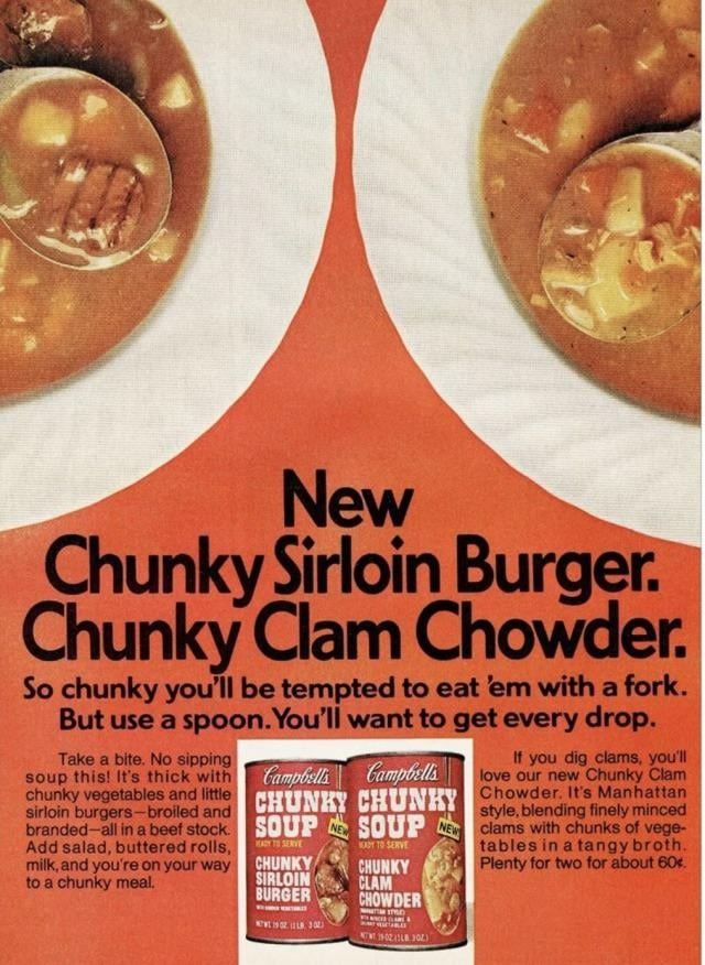 You’re likely familiar with Campbell’s Soup, whether it’s been a staple in your pantry or featured in countless art pieces. While Andy Warhol popularized Campbell’s Tomato Soup in the 1960s, Chunky Soup became the star of the 1970s. Launched in 1971, it was marketed as a “meal in a can,” with the tagline “soup so chunky you’ll be tempted to eat it with a fork.” Options included chunky chicken, beef, turkey, and vegetable varieties.