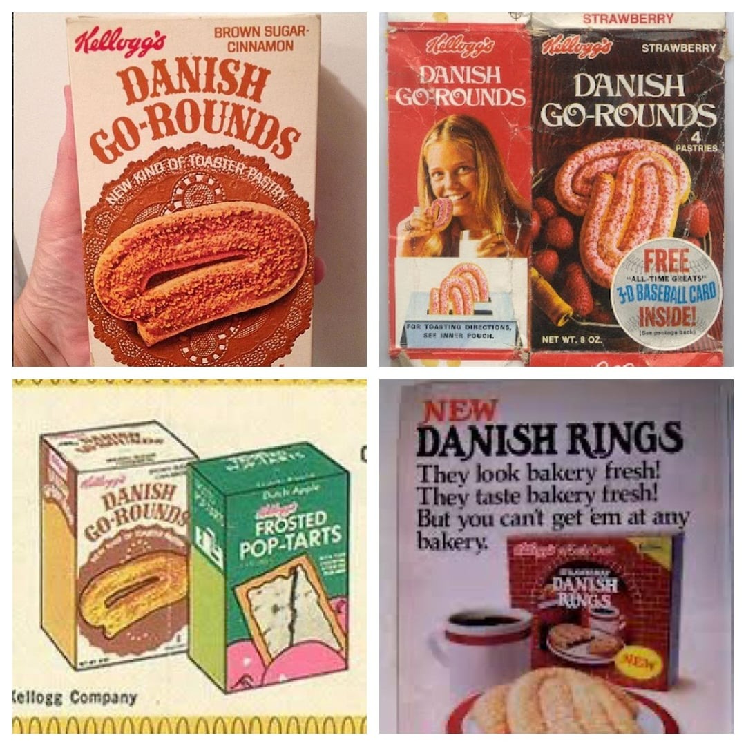 Kellogg’s launched Danish Go-Rounds in 1968, inspired by Pop Tarts and featuring a variety of fruit fillings encased in a circular pastry. Flavors included strawberry, blueberry, and cinnamon, and they were marketed as a fun alternative to traditional Danish pastries. However, the product struggled to gain popularity due to packaging issues that caused them to fall apart easily. In 1977, Danish Go-Rounds were discontinued and replaced by Danish Rings, which featured a new shape created by stamping the pastry instead of tucking the filling inside and coiling it.