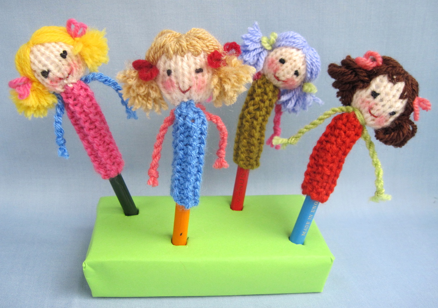 Make bodies out of pens or pencils to create stick dolls. You can add clothing made from fabric or paper to dress them. Add rounds beads to make the head, and paint faces on them.