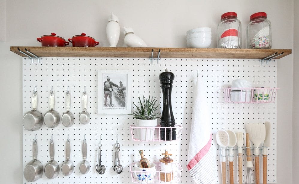 The pegboard will do two jobs in one here. It’s a handy backsplash for your sink, and it will allow for more kitchen storage space. You don’t have to leave it plain white either, paint it whatever color looks best!