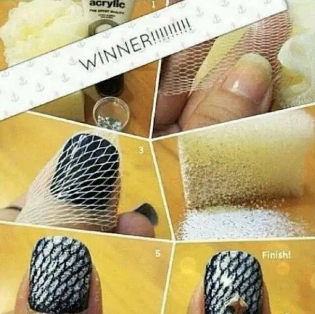 Use an old loofah and a sponge to create a fishnet stencil. Paint a base coat, hold the loofah over your nail, and dab with a sponge. Voila!