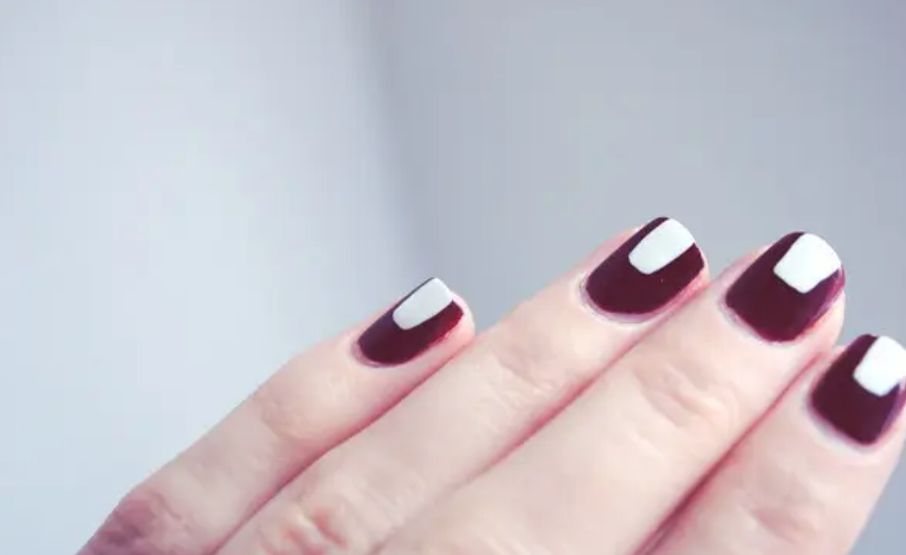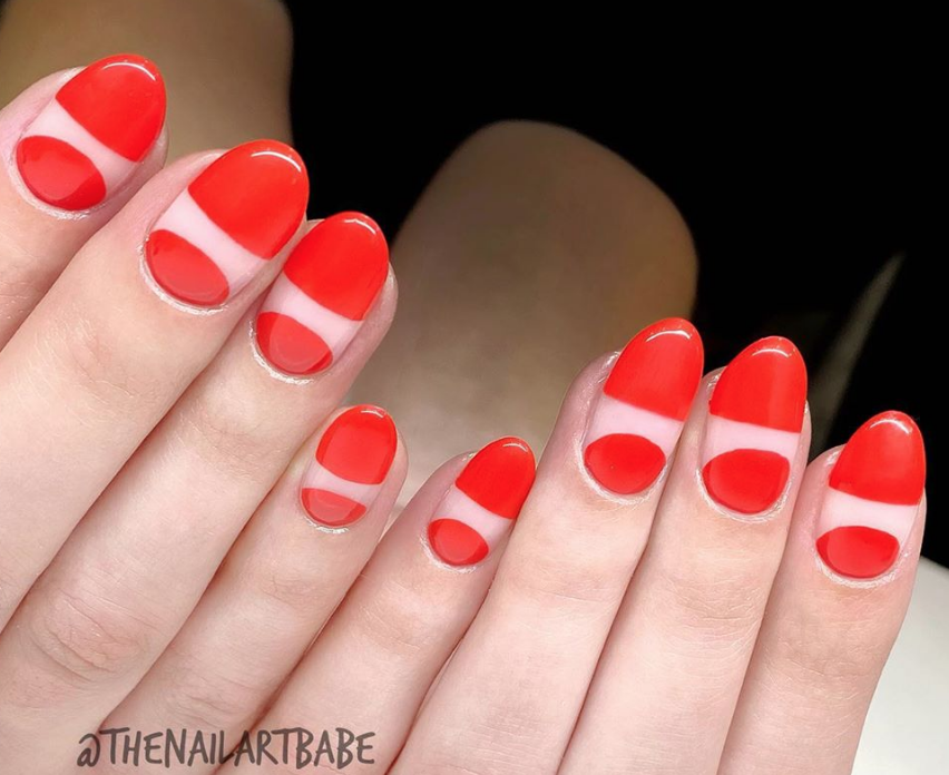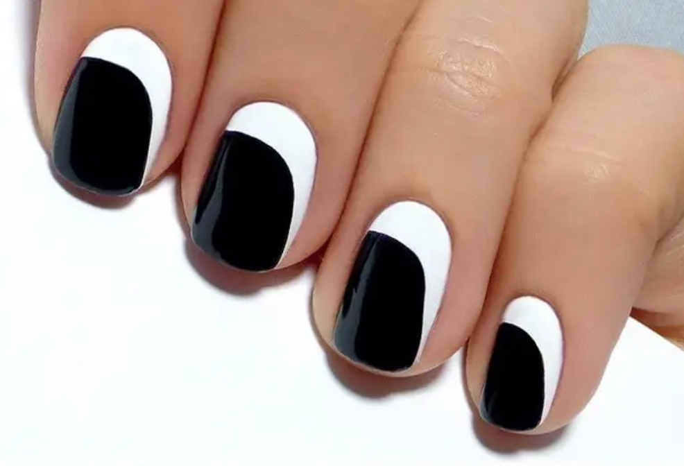 Apply a base colour (in this case, white) and then carefully paint a curved line in black. Fill in the space with more black polish and you’re done! Try it with different color combos to switch it up.