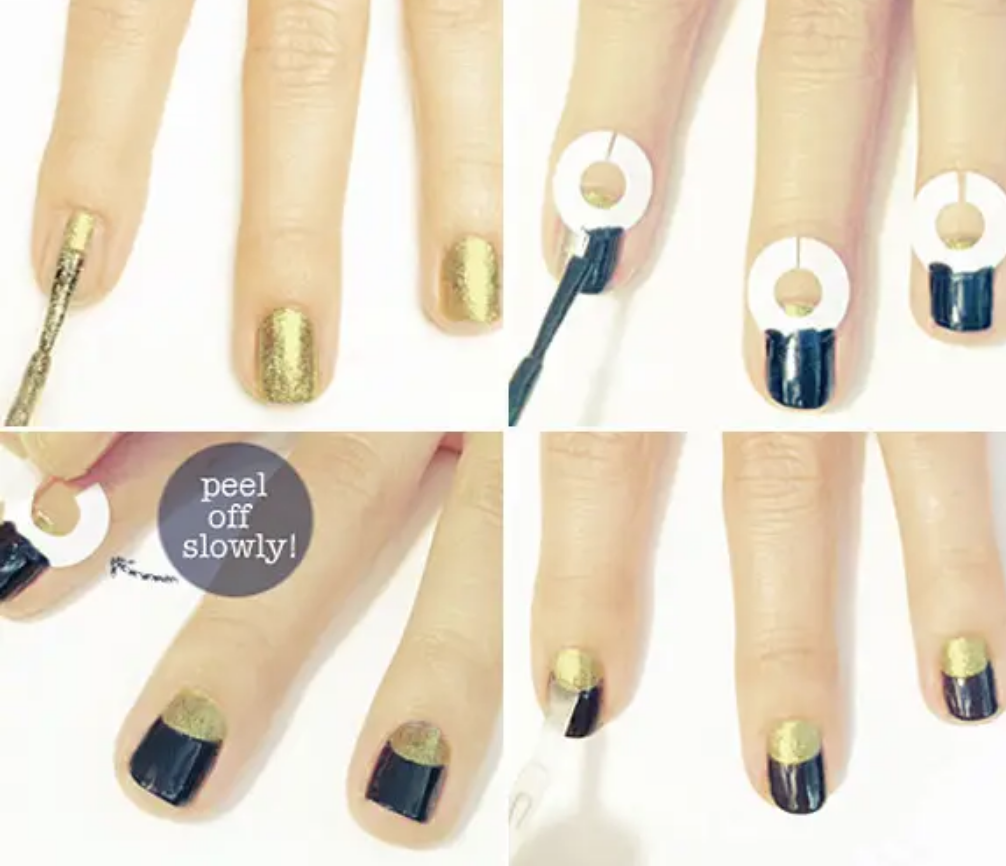 Have some extra office supplies lying around? Use binder paper reinforcements to get the perfect half moon shape. Apply a base coat and wait for it to dry completely. Then stick the binder reinforcements over your nails and paint the second color coat over top.