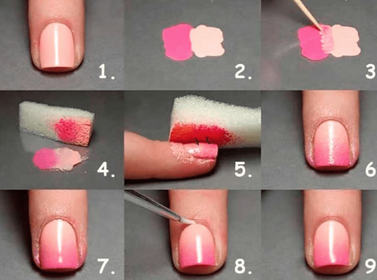 Apply a base layer of your preferred colour, and then add a glitter nail polish concentrated at the tip of the nail, and lightly brush it down no further than the centre of the nail. No sponge required for this one.