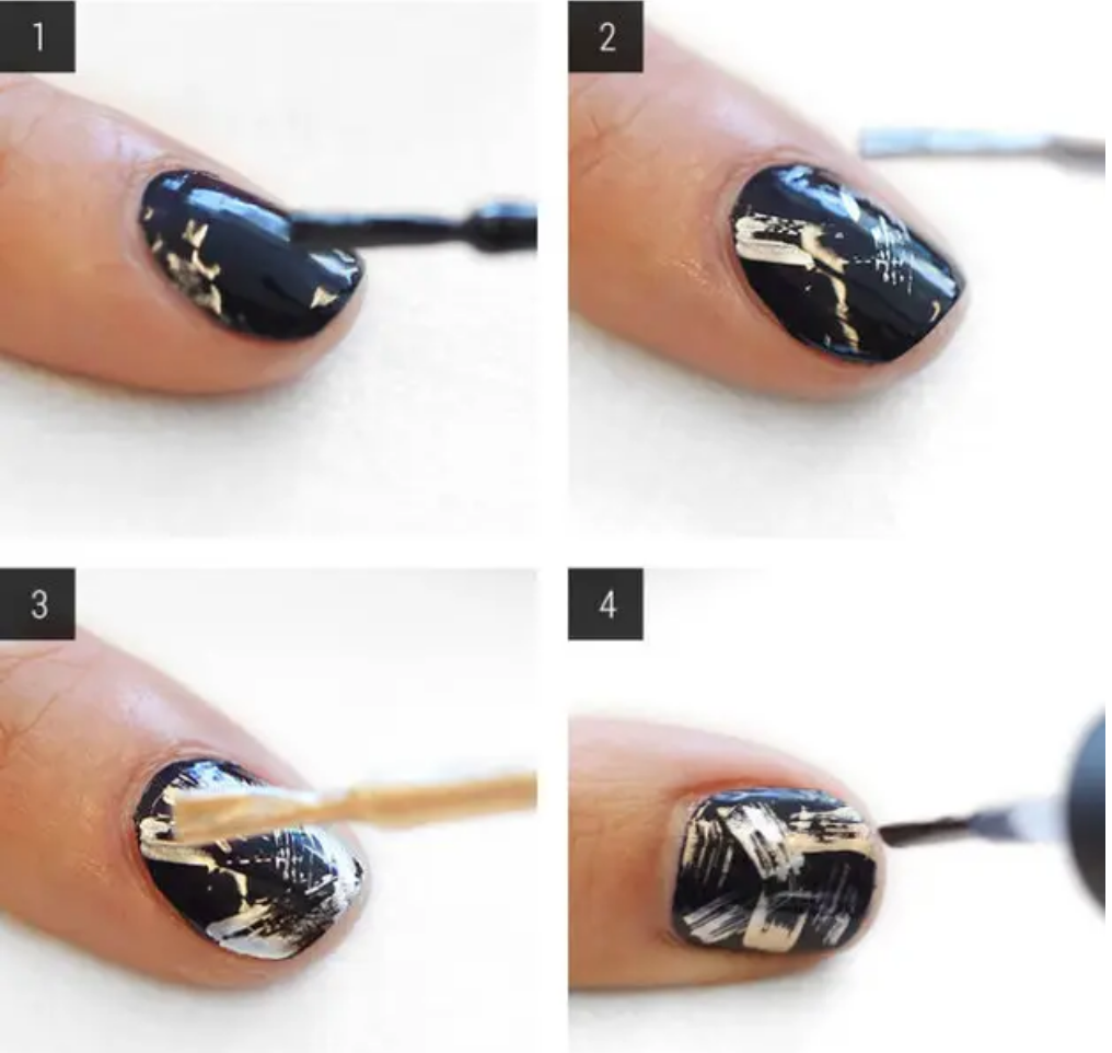 Apply one base layer, and then get crazy! Flick your polish haphazardly across your nails to achieve an abstract splashed paint effect.