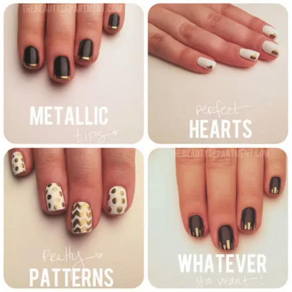 A little bit of gold can really dress up your nails. It’s perfect for a special occasion or holiday look. All you need is a little bit of gold leaf, a nail file, some scissors, and a Q-tip! The gold leaf will stick to the nail polish, so all you have to do is cut out the shape you want, apply it to your nails, and then use the file to remove the excess from the tips. Done!