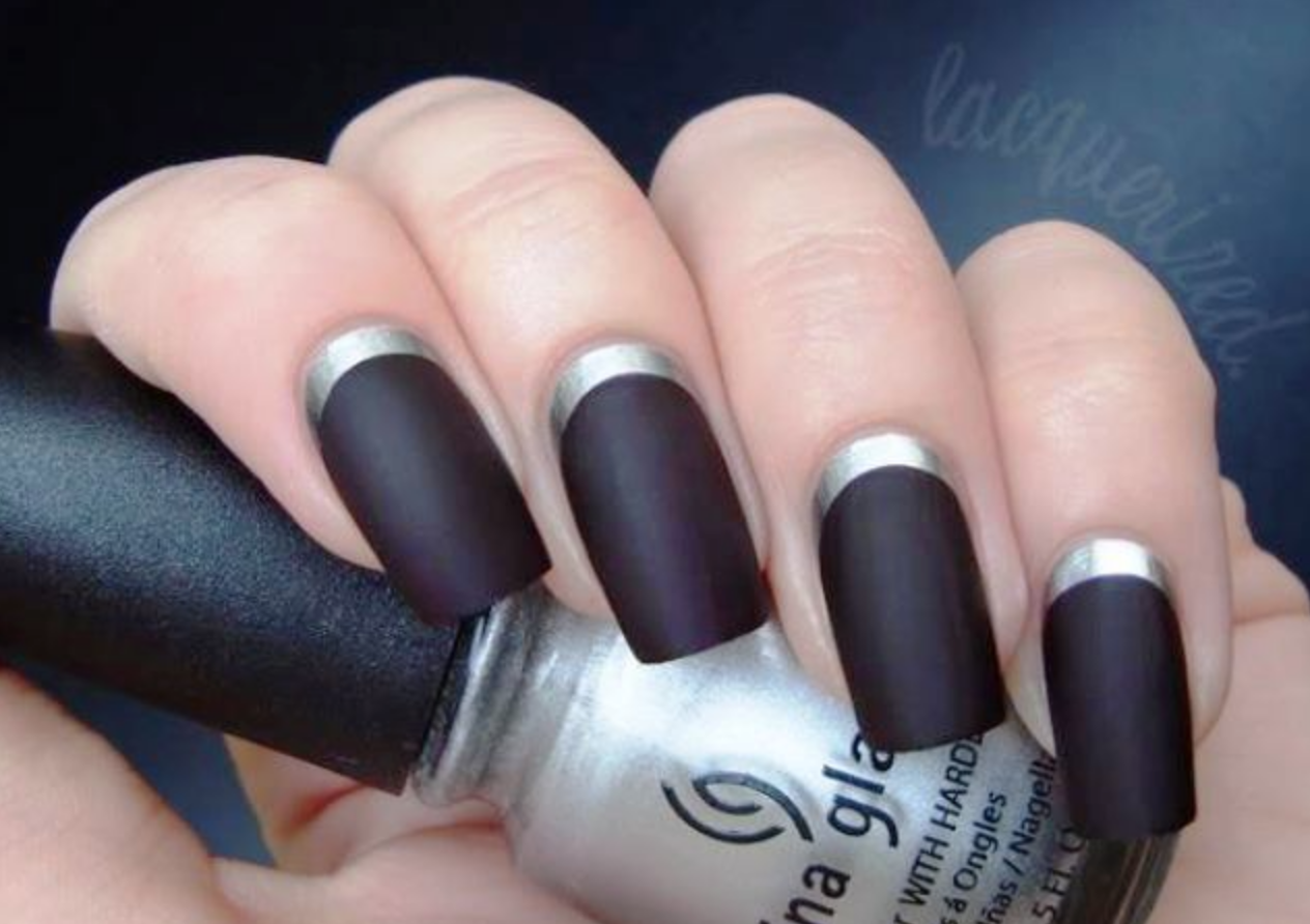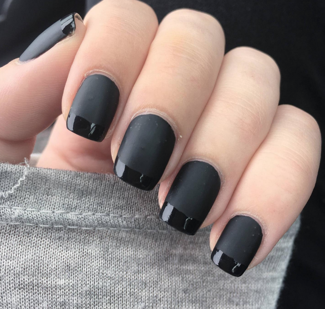 Get this sleek look easily with two nail polishes. Use the matte black as a base coat over the whole nail, and then use the glossy black across the tips. Simple as that!