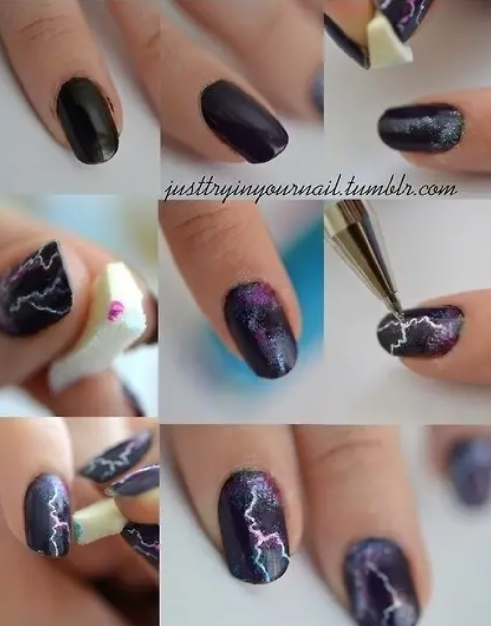 Apply a black base coat and lightly sponge on some dark purple and white accents. Use a very thin micro-tip pen in silver or white to draw in a strike of lightning. Voila! Easy as pie.