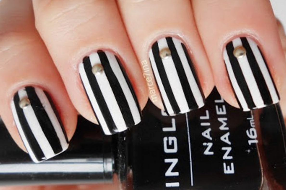Black and white pinstripe nails! Use tape to keep those lines straight, it will be most noticeable with this design if they’re out of line. The stud at the bottom is optional but it looks pretty cute! Even without a stud, you could add one dot of a fun color at the base for an extra unique touch.