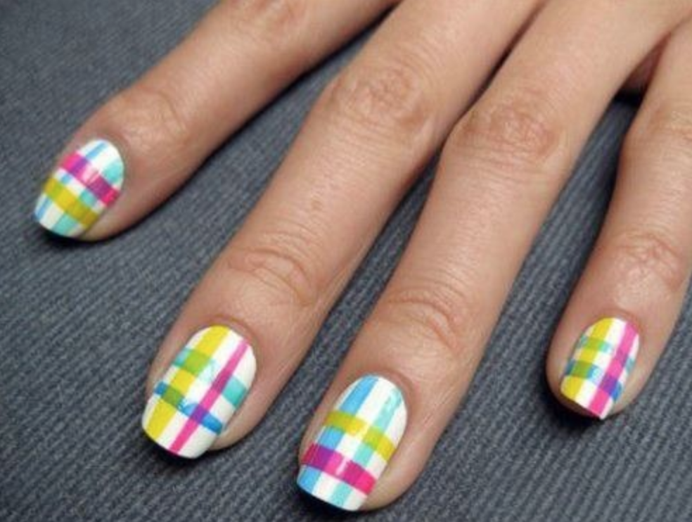 This looks like a complex design but only takes a few swipes of the brush. Apply a white base coat, wait for it to try, and then choose the first color you want to use. Draw one or two lines on every nail either vertically or horizontally. Wait for that to dry then do another color, let dry, and then another.