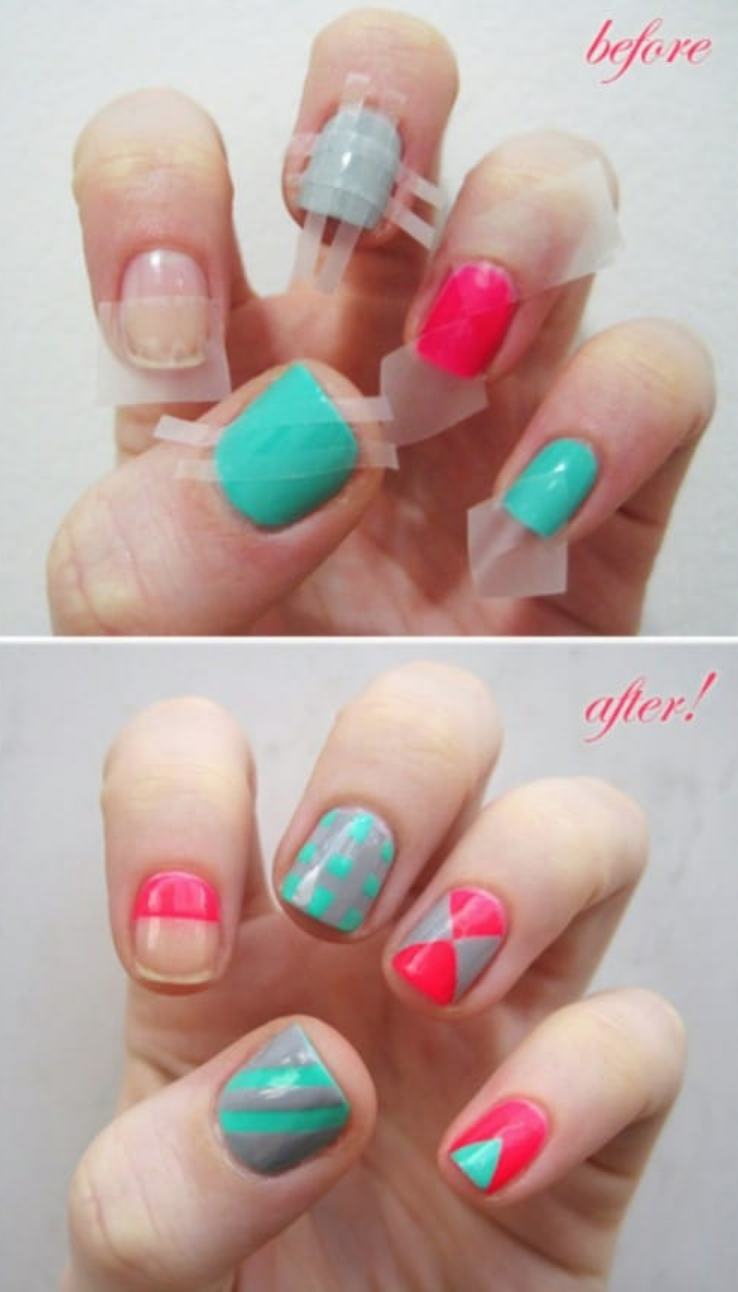Follow the easy sponge gradient trick from tip #6. Use some tape to create fine crisp lines, or a nail pen to design these geometric shapes on all your nails, or just one feature nail for a pop of color! (And to save time).
