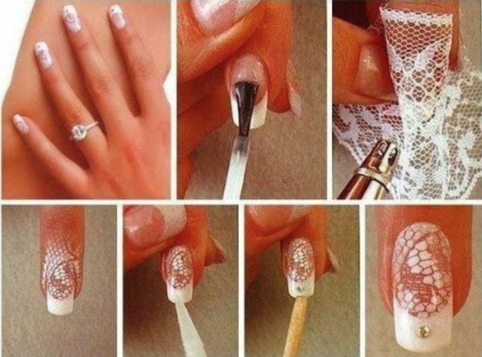 Prepare your nails with a base coat of clear polish or color. Take a small piece of lace and place it over your entire nail, where you want the pattern to be. Dab some white nail polish on with a sponge to transfer the pattern over. Easy as pie!