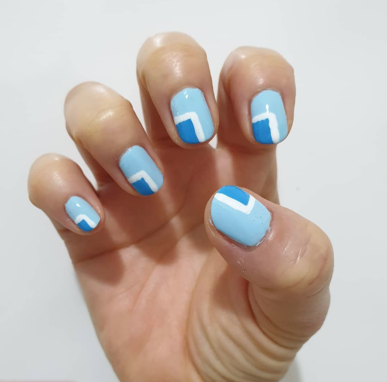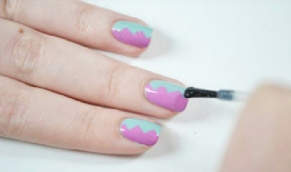 Apply a base coat and wait until it’s fully dry before applying the tape. Cut the tape with the wavy scissors to get the zig-zag effect, and then apply to your nails. Use the second polish to fill in the area of the nails without tape, wait for it to dry, and remove the tape to reveal your design!