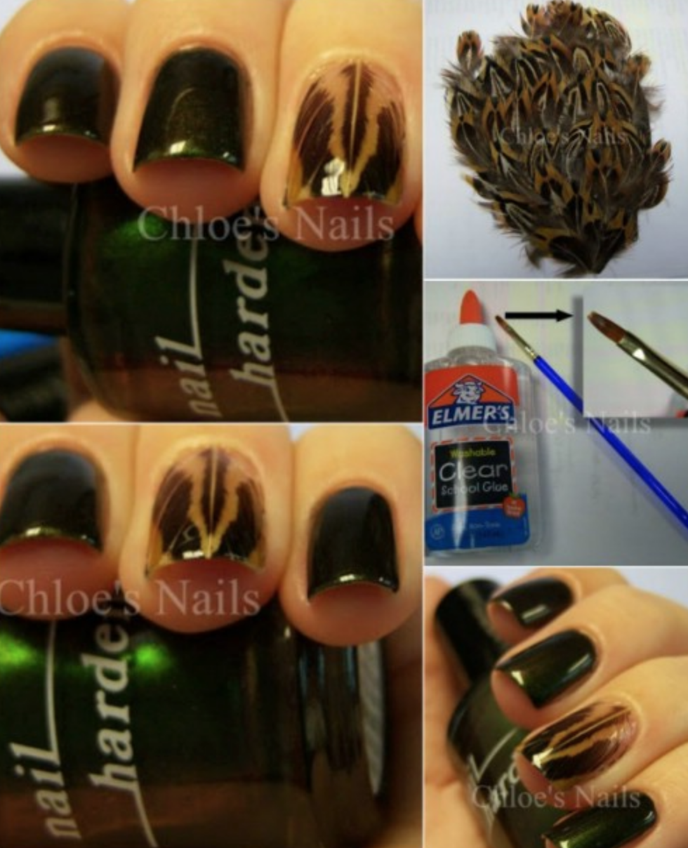 Take a real feather and cut it to fit your nail. Take some clear school glue and put the feather in place, then paint over it with another layer of glue, and then a layer of nail polish to smooth it out. Make sure you use an old brush you don’t mind throwing away after the fact, because the glue will dry up and make it unusable.