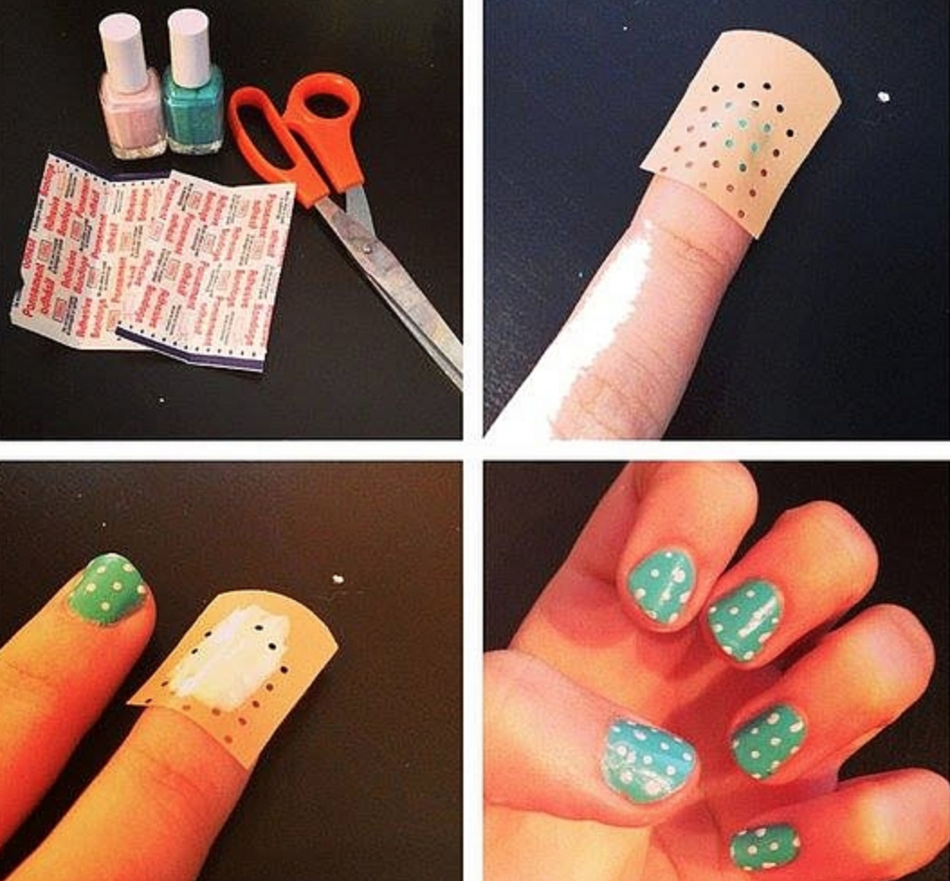 Apply a base coat, wait for it to dry completely. When dry, apply a breathable Band-Aid with holes in the adhesive. Attach it to your nail and fill the holes with the second color of nail polish. Bing bang boom – quick dotted nails!