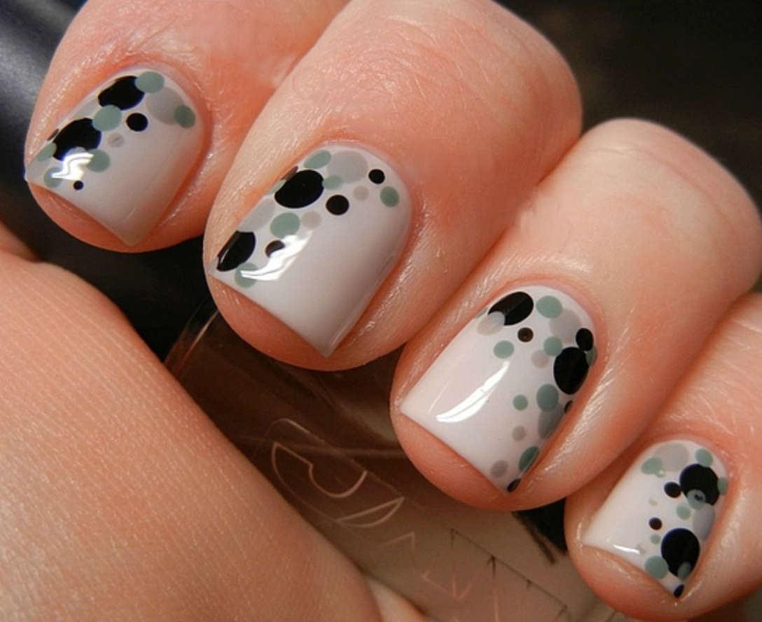 Apply a base layer of whatever prominent color you want for your nails. Take a tooth pick and dip it carefully so just the tip is holding some white nail polish. Put some small dots over your nails, topping up the white polish as needed. Dip the toothpick into the polish a little further to get bigger dots and add a few of those to the nails. Wait for it to try then add a top coat to smooth them out and you’re done!