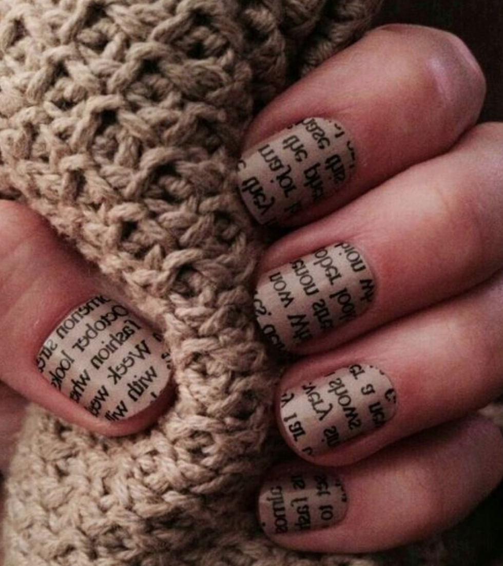 Are you a book lover? This style is for you! Paint your nails a light color like grey, pink, or white. Soak one finger at a time in rubbing alcohol for about 5 seconds and then apply the newspaper to the nail so the ink can transfer. Cover with a top coat to make sure the ink has set.