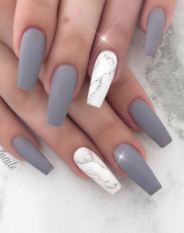 Another stunning look for those with long nails or extensions. Choose a vibrant color and paint three nails on each hand entirely. Leave two fingers bare. On those bare nails, apply a light pink or nude base coat and let dry. Cut a piece of tape to achieve the shape you want – basically the exact size of your nail but just slightly smaller. Apply the tape and paint the vibrant color around the outside, and reveal to create an outline just at the edge of the nails. Stunning!