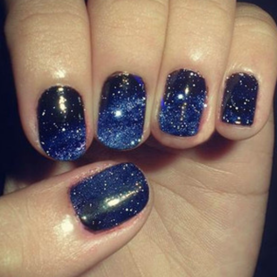 Use the gradient effect on your nails from dark blue to sapphire, then splatter on various “stars” with white paint for a three-dimensional effect.