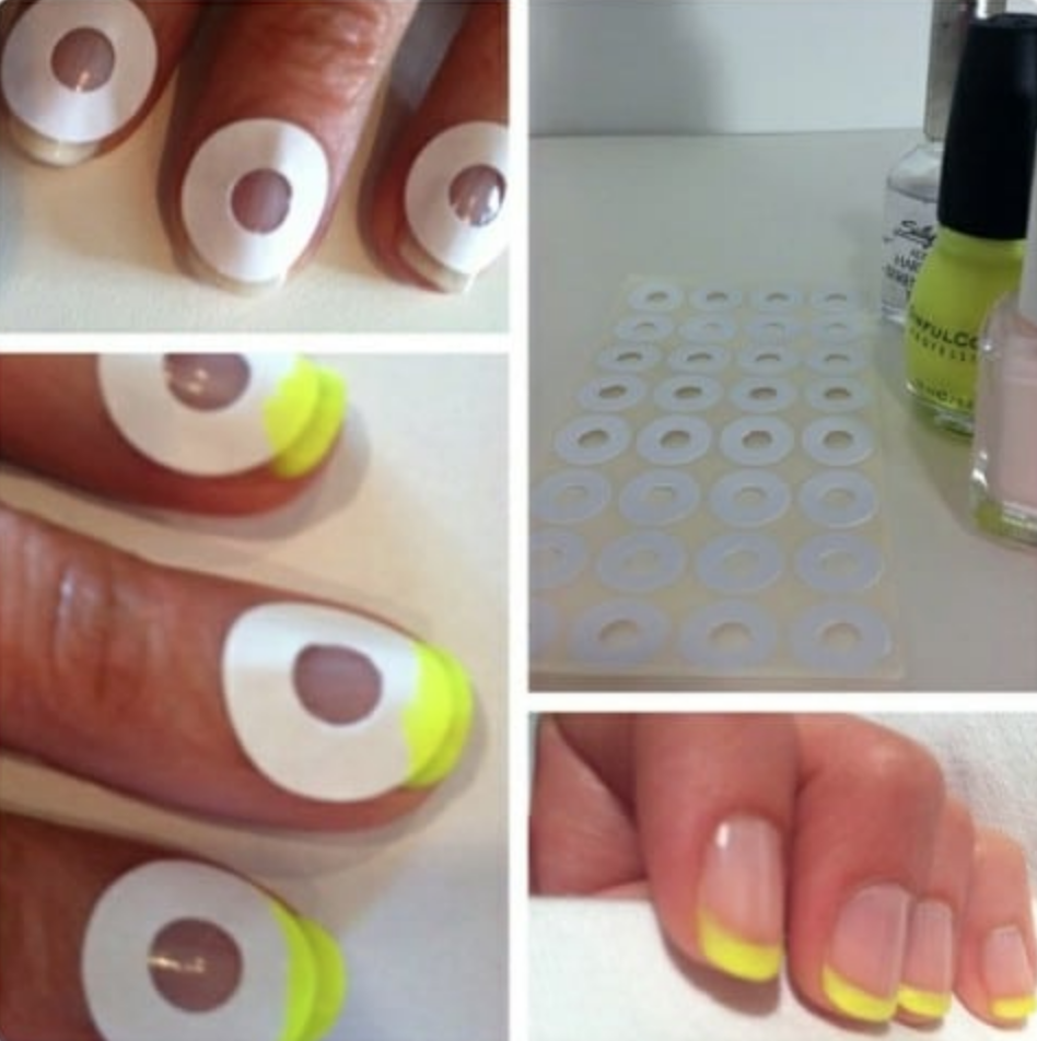 Use binder ring reinforcement stickers for the original French manicure. Place the stickers on your nails where you want the line to start. Now you don’t have to worry about making the perfect line with your shaky hands. This works better than tape since you’ll get a natural looking round line instead of a straight one.