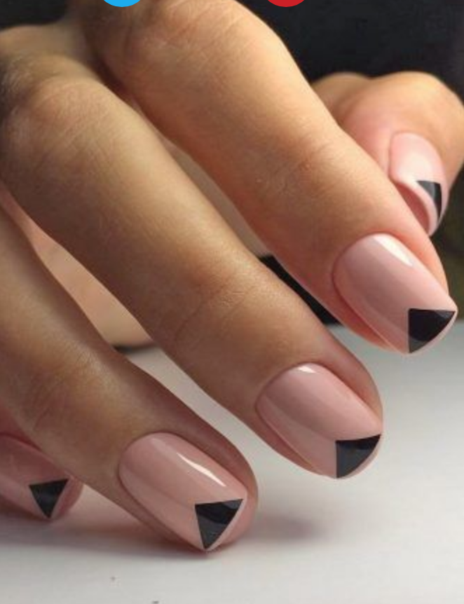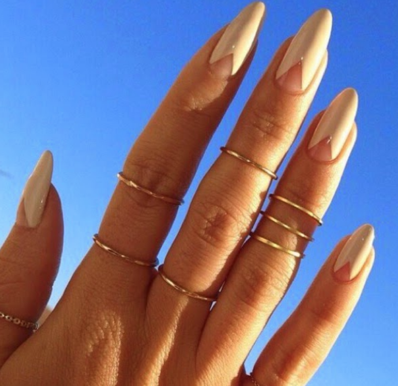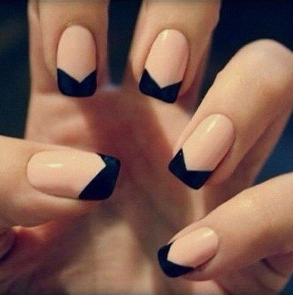 Shape your nails (probably falsies unless you have some serious strengthener and a job that doesn’t require typing) into a pointed almond shape. Paint a base coat of a very light ballet pink and wait for it to dry. Use some tape to ensure crisp lines and create a triangular black tip. Bonus step: apply some lipstick and do whatever this girl is doing.