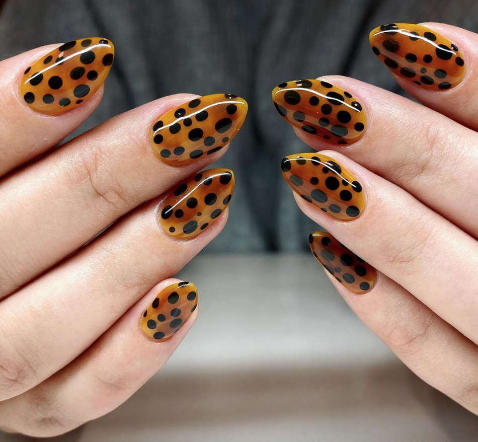 Get out your sponge and mix a dark yellow and light brown palette together. Dab them together over the entire nail until you’re happy with the balance. Wait until dry, before adding some medium sized black dots (use a bobby pin for best results). Apply a top coat for glossy cheetah print talons!