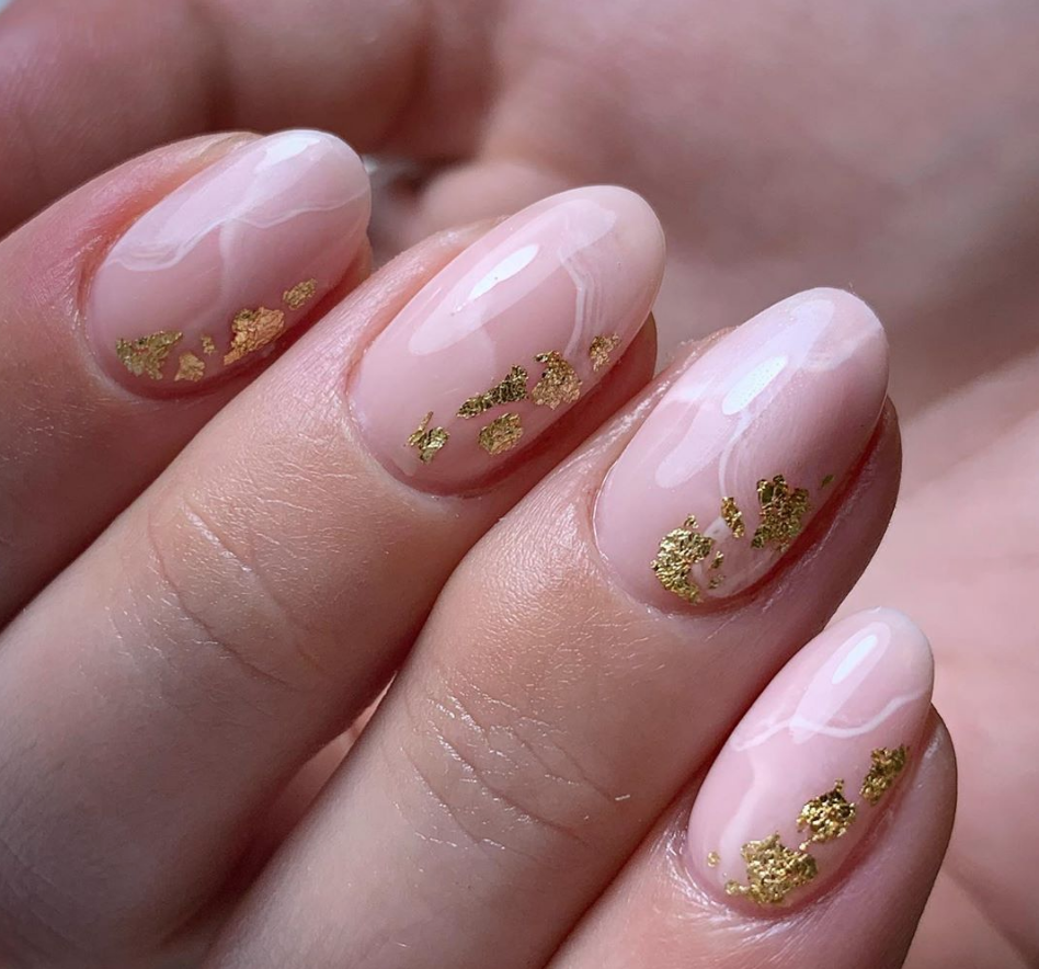 This is a luxe look you can achieve in just a few quick steps! Choose your favorite ballet pink and apply two coats so it’s adequately opaque. Strip up some small gold leaf pieces and apply them carefully with a pair of tweezers to the bottom corner of each nail. Gloss it over with a top coat to keep everything in place.