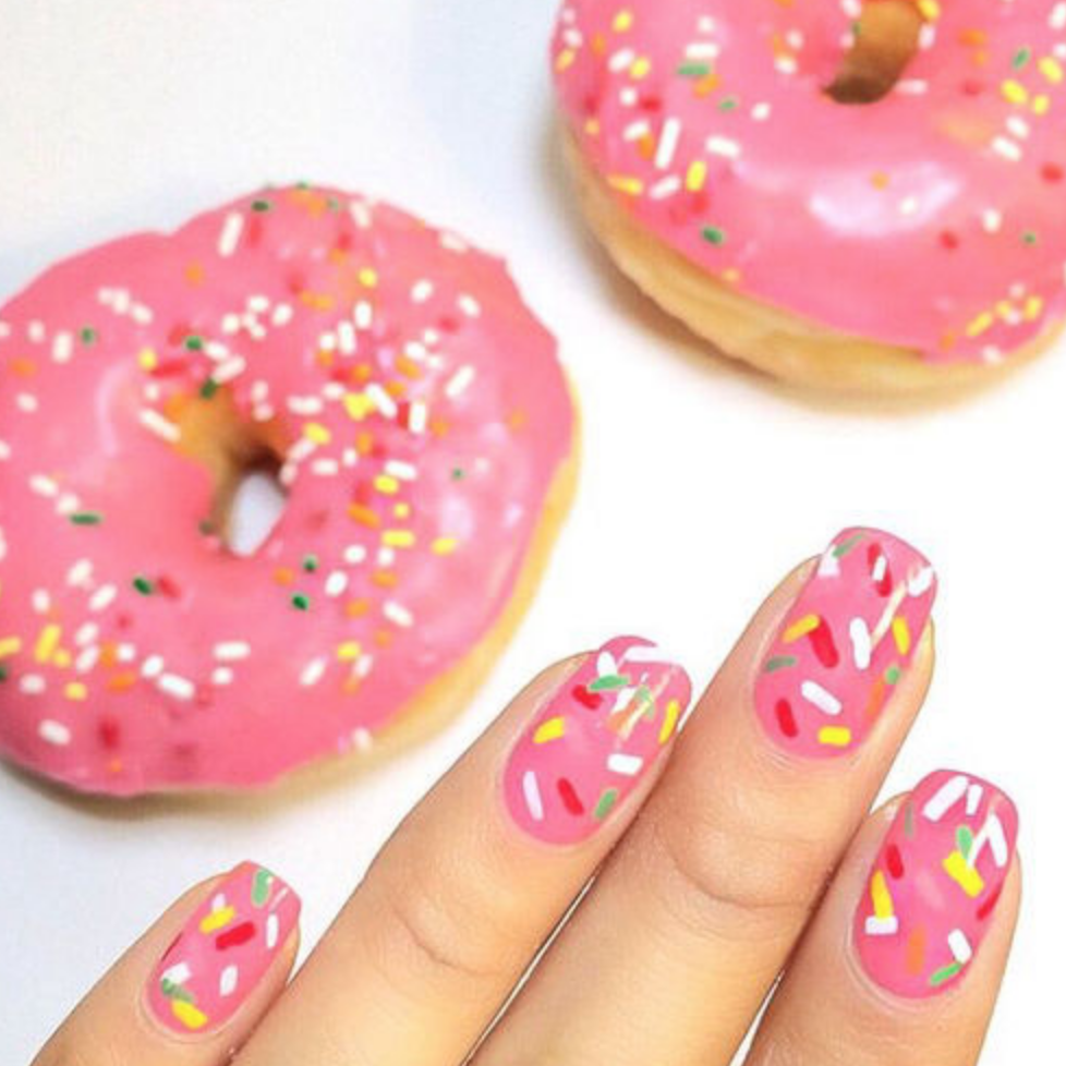 Looks good enough to eat! Paint a barbie pink colour over the entire nail and let dry. Then, take some of your brightest colours (red, yellow, green, white, etc.) and brush tiny lines across different areas of the nail to give a sprinkled effect. Yum!
