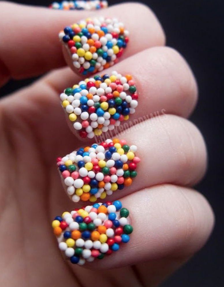 This one is a little more challenging, so I saved the most advanced for last. For this one, you can use real candy sprinkles, or find some small plastic ones at the dollar store. Apply a base coat and let dry before applying some nail glue across the entire nail. Dip your finger in the sprinkles and they should adhere to the glue. Fill in any naked areas manually. Voila!