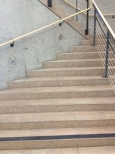 ¡Otro clásico fracaso de institución educativa! Esta en particular es doblemente fallida. Primero, falla en diseño, esos escalones tienen una orientación distinta a la del barandal. Segundo, colocaron otro pasamanos justo en el medio y ahora las escaleras no van a ningún lado y son completamente inservibles. Bravo, escuela, bravo.