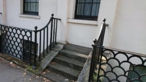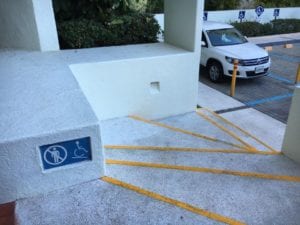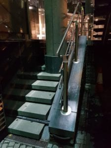 Esta rampa de acceso para discapacitados no es apta para cardíacos. Esta “rampa” no sólo está compuestas de escalones anchos, sino que, también, las personas sin discapacidad tienen prohibido transitar por ella. Estás solo en este viaje, amigo mío. Con suerte, tu silla tendrá unos buenos frenos.