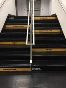 Si quieres que alguien vaya más lento antes de usar unas escaleras, toma páginas de un libro de auto-ayuda y confunde a las personas pintando fragmento de las frases en la parte frontal de los escalones. Pasarán tanto tiempo tropezando con las oraciones que no les dará tiempo de tropezar con los escalones.
