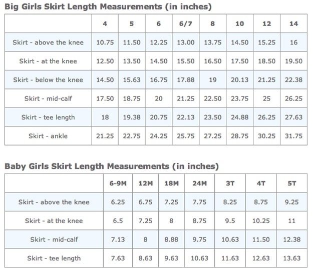 Keeping track of skirt lengths is difficult, especially for children. An easy way to track the proper lengths you need is to print off a length chart and keep it close for when you need it.