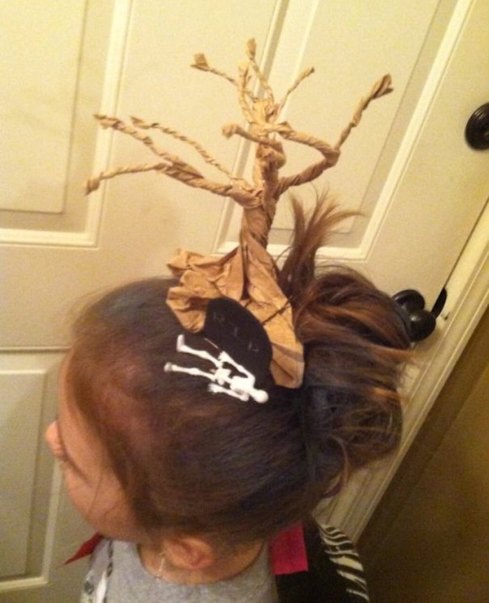 It’s a little macabre, but so creative. Although I am wondering what mom or dad does for work. Perhaps an archeologist? That would explain the entombed mummy in her hair.