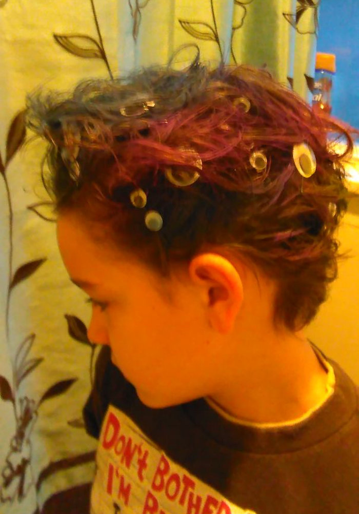 This crazy hair day could have doubled with bring your pet to school day. That’s a seriously fabulous take on a mohawk style.