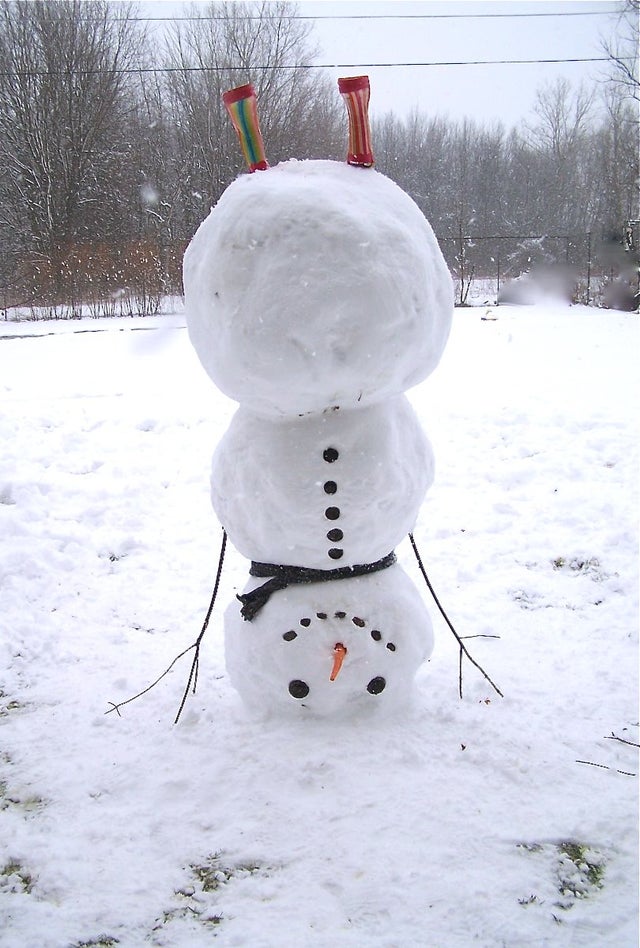 These people got created an did a completely inverted snowman! Start with the smallest snowball at the bottom and the biggest one at the top. Add some sturdy sticks for arms because those provide a lot of support to the middle.