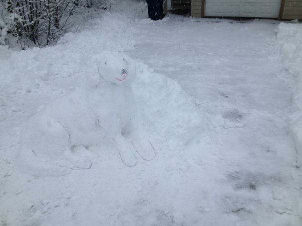 Although goofy looking this snow is still cute. Embellished with a collar even. If you don’t have any pups and are missing them this winter all you need to do is get some snow make yourself one!