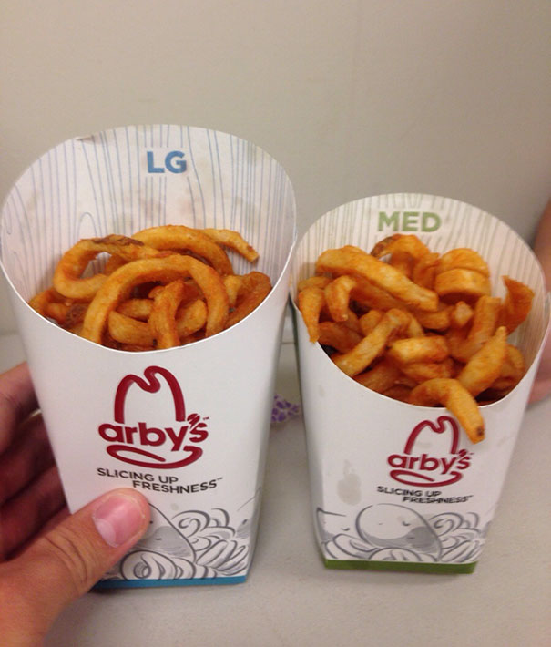 Apparently, you don’t get any more curly fries if you order a large over a medium. That’s how it appears when comparing the two orders next to one another. We would have to count the fries individually to verify the deceit.