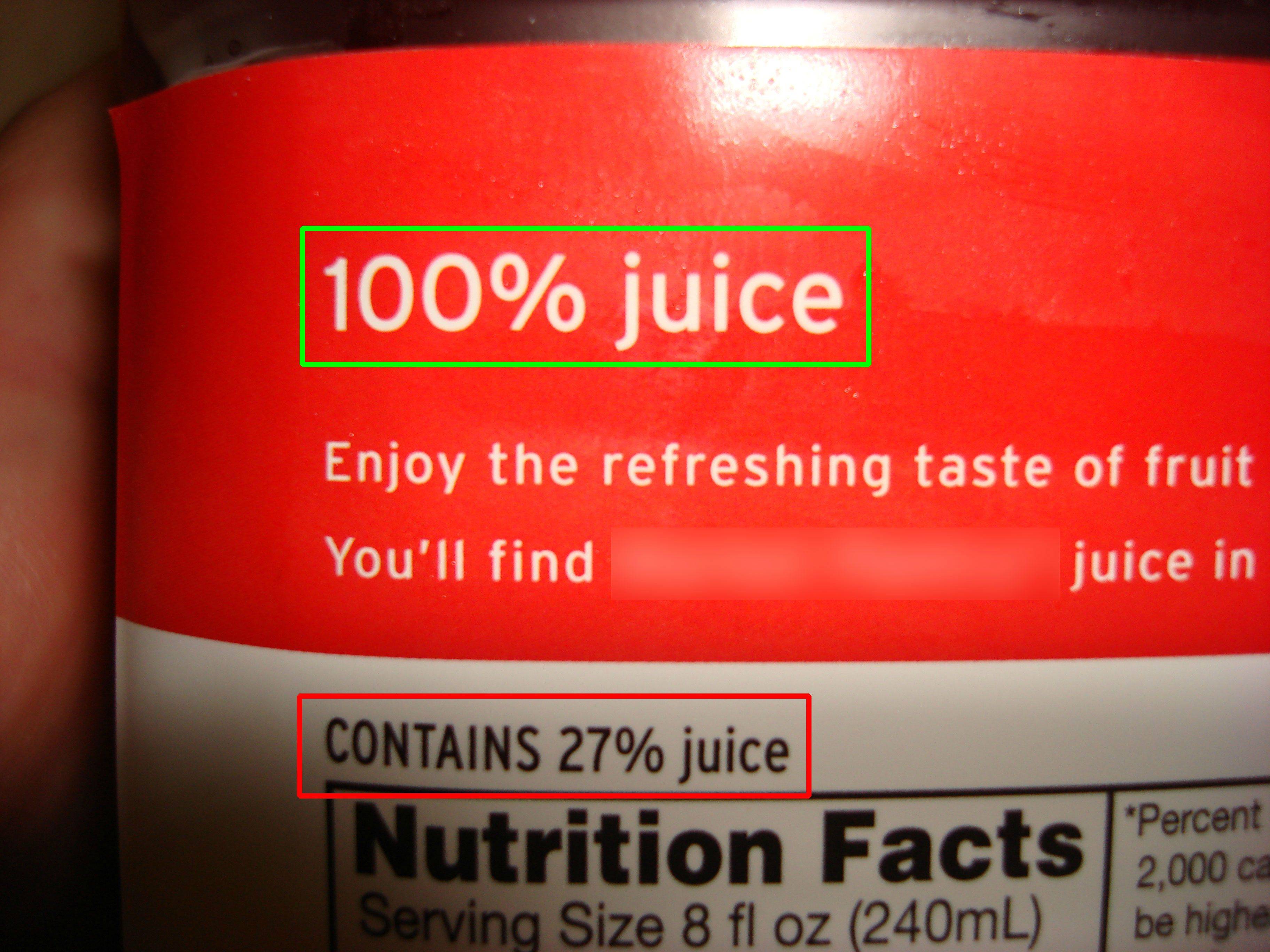 On the top of the bottle, it says it is 100% fruit juice. Although, it’s important to read the fine print. Down by the nutrition facts, it states that it is only really 27% juice.
