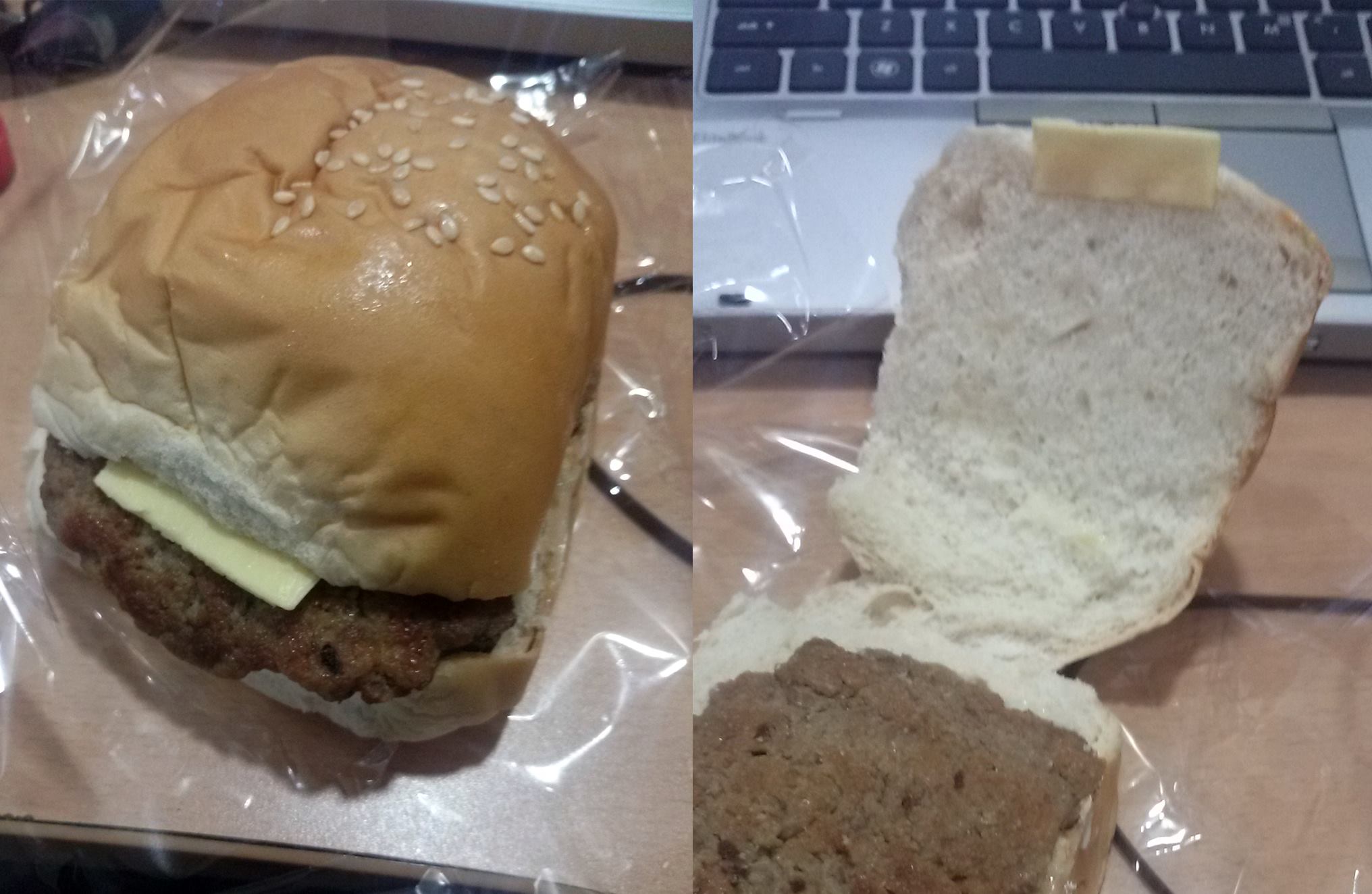 This cheeseburger was purchased from the streets of Manila, Philippines. The cook attempted to trick the customer by placing a small sliver of cheese on the edge of the bun. It’s a pretty hilarious cost-cutting measure.