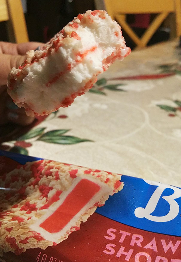 There is not much strawberry filling in the middle of this ice cream bar. It’s very disappointing. The package shows so much more of it.
