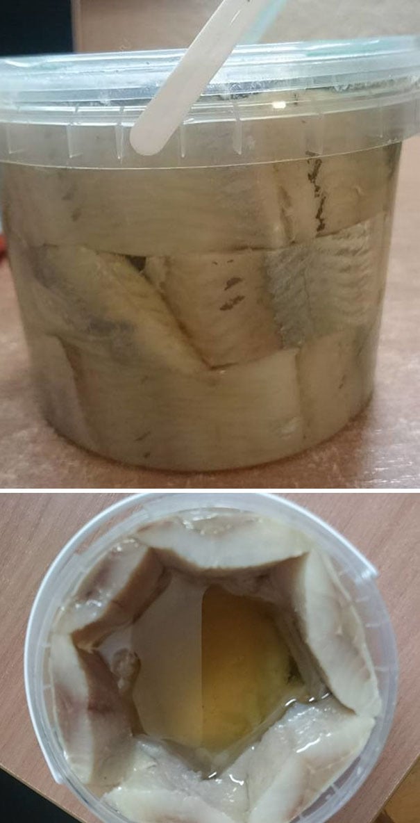 All of the pickled herring in this container is packed up against the edges so it looks totally full. However, the center is just a bunch of oil. It’s pretty misleading.