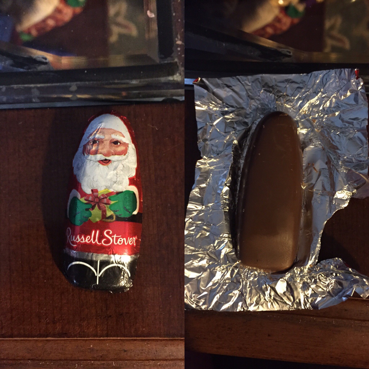 The chocolate Santa has no details. It’s just a blob of chocolate. Normally, these sorts of chocolates have at least some minor designs on them.