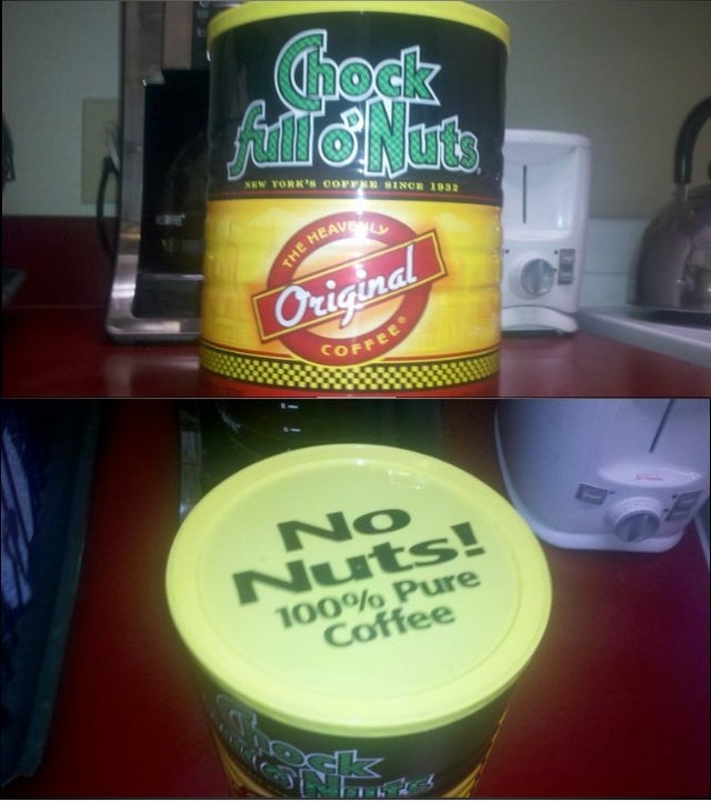 The brand name of the coffee is called “Chock full o’ Nuts”. However, it actually contains no nuts. We can understand how it might cause some confusion.