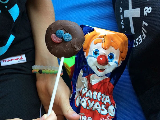 “I Bought my son a clown pop in Mexico,” explains the father. It doesn’t look at all like a clown. It is a chocolate pop with a couple of sour gummies plastered to the side of it.
