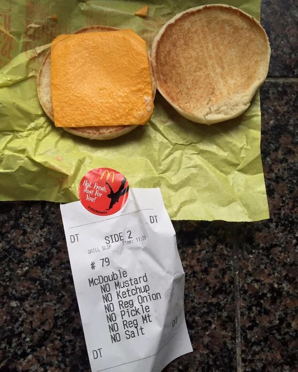 “Went to McDonald’s and ordered a plain McDouble. The guy at the drive-thru asked ‘So you don’t want anything on it?’ ‘Just cheese.’ I replied. This is what I got….” explains the man. It just goes to show you have to be very careful what you ask for at these restaurants.
