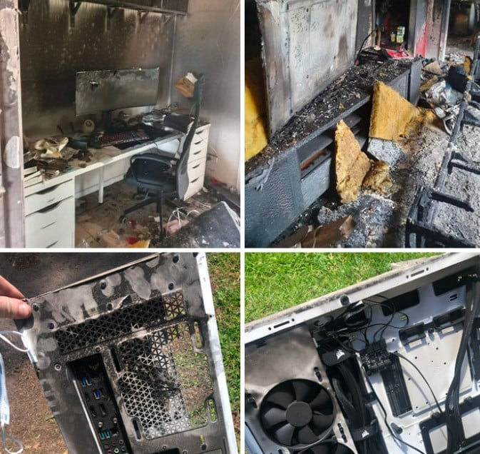 Woke up Friday to my wife screaming ‘fire.’ She got the kids out, and I grabbed the pups before everything went up in smoke. Firefighters think a faulty outlet ignited the couch. Lost my PC and other things, but stuff can be replaced—family is everything. – Reddit